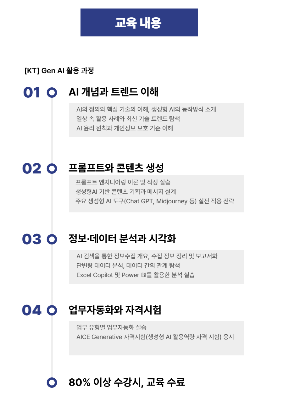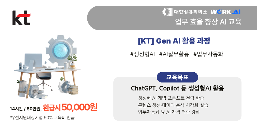 생성형 AI의 프롬프트 설계 원칙과 콘텐츠 생성·데이터 분석·자동화 역량을 익히고, 시나리오 기반의 실습을 통해 생성형 AI의 활용 역량을 강화하고 실무에 적용할 수 있다.