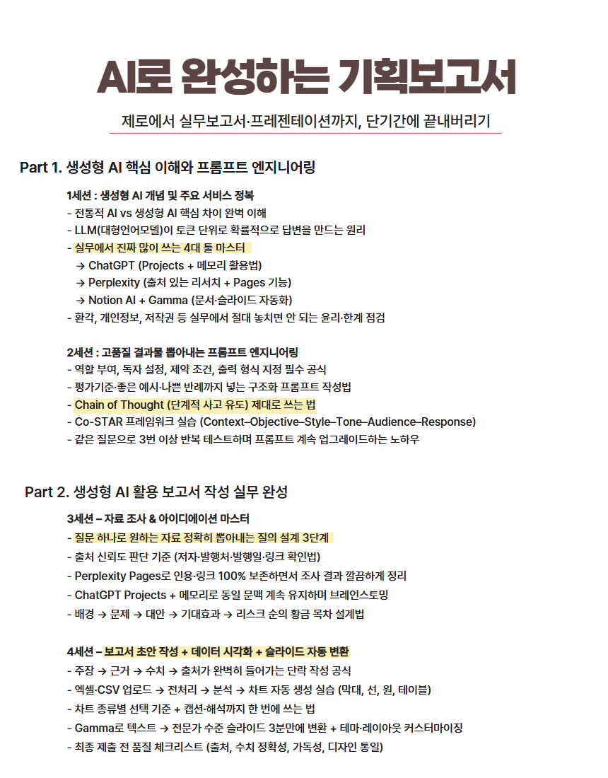 - 생성형 AI를 활용하여 기획 및 보고서 작성 역량을 강화하고자 하는 실무자