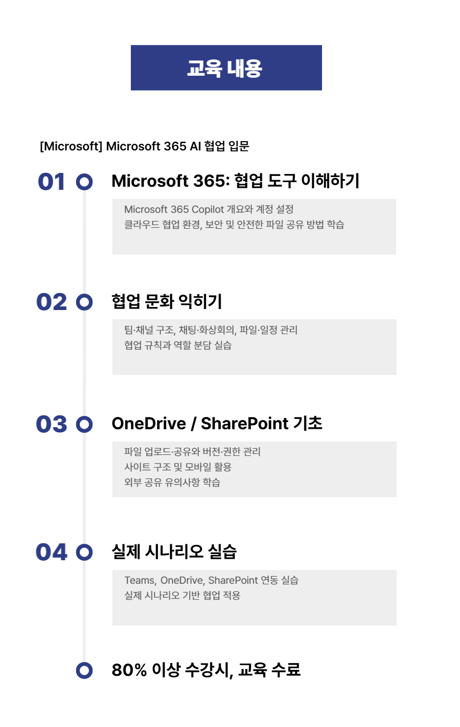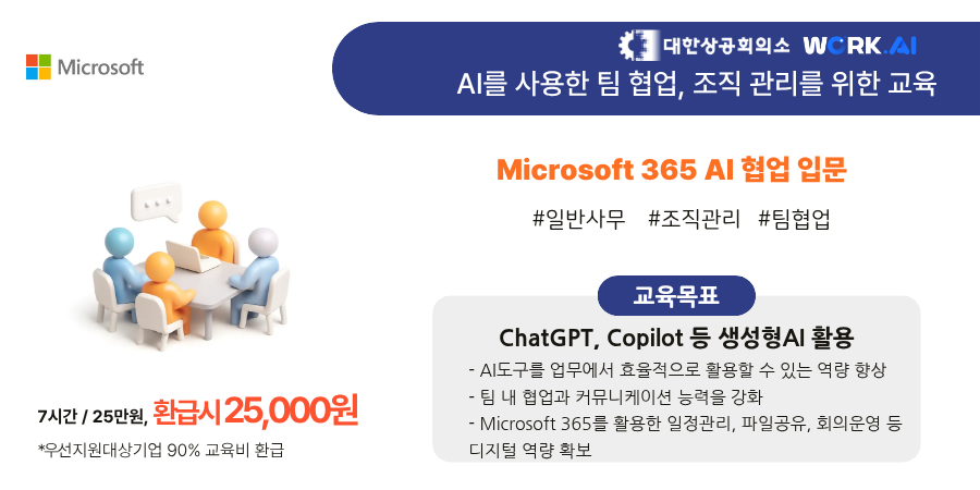 - Microsoft 365의 Teams, OneDrive, SharePoint 등 주요 협업 도구를 실습 중심으로 익히고,